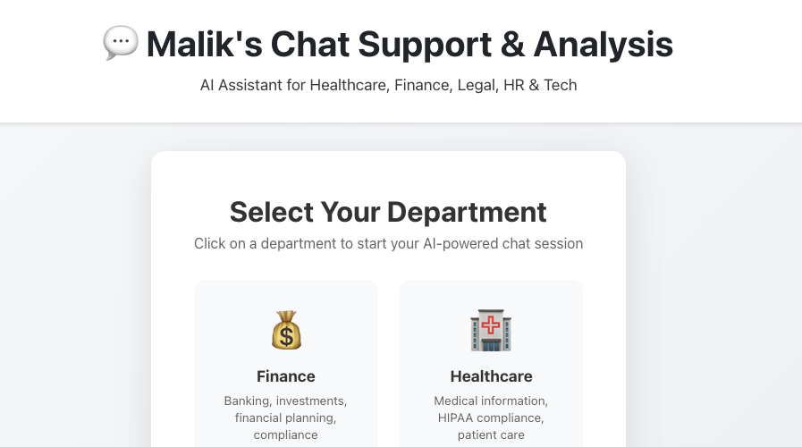 Enterprise-grade multi-agency chat platform with real-time API integration. Features specialized AI agents for Finance (live stock data), Healthcare (FDA database), and HR departments with RAG-powered responses, sentiment analysis, and comprehensive analytics dashboard.